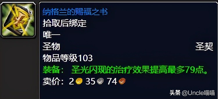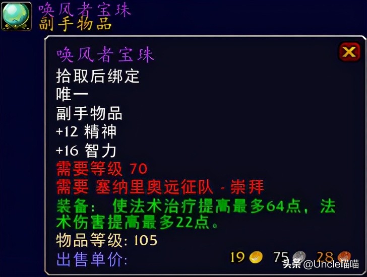 当然对于很多牌子需要集中换取更为经典的装备的玩家来说,喵叔这边重点推荐这款辉煌希望项链,出自于旧希尔斯布莱德丘陵BOSS时空猎手。可以说这款项链是前期奶骑和萨满优先级非常高的颈部装备了,可别因为它没有属性加持而小看了它,你可以看到53点的法术治疗提高真的是比紫色装备永恒希翼项链还要来得实在,而5秒恢复9点法力值也算是对于属性缺失的弥补吧,经典蓝装紫色品质的东西你值得拥有,推荐指数满天星辰直戳天花板。