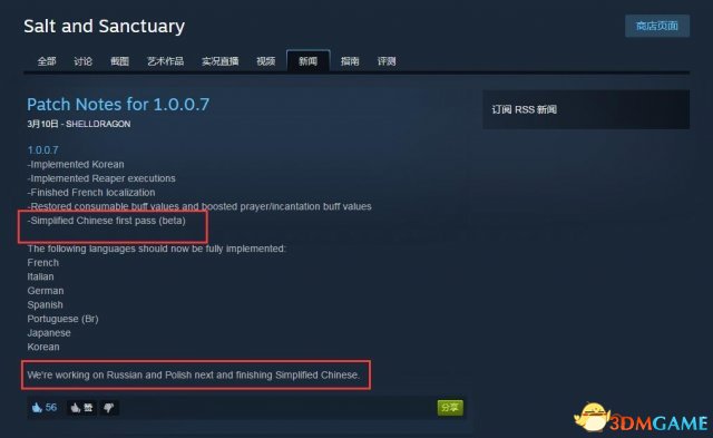根据《盐和避难所》官方在Steam社区发布的公告,游戏已于今天推出了1.0.0.7补丁,更新了一部分处决动作以及正式版的韩文、法文支持,同时本补丁也加入了初版Beta简体中文翻译。同时开发者也表示,他们也在努力完善简体中文版游戏,预计在工作完成后,官方也会正式为游戏加入简体中文。