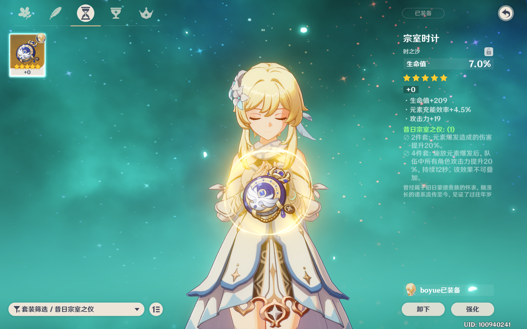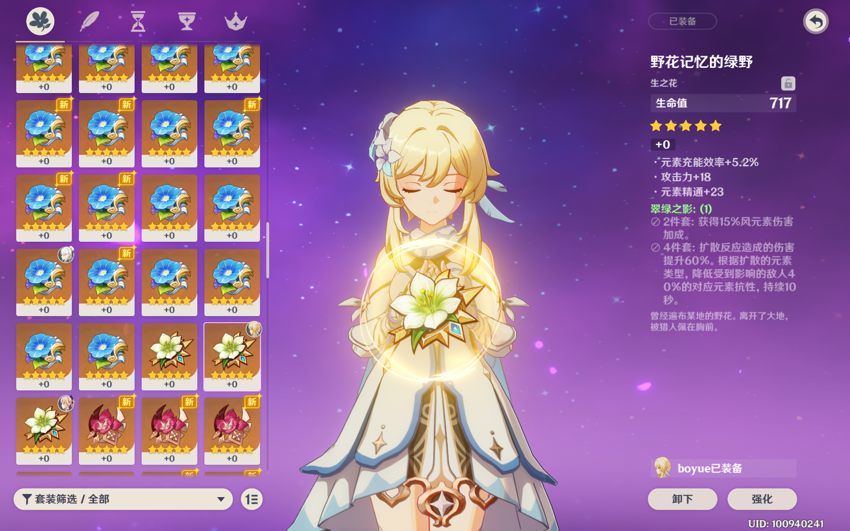 圣遗物:翠绿4件套,风套真的强,推荐攻击沙,风伤杯,双暴头;副属性优先级推荐充能>精通>双暴>攻击。