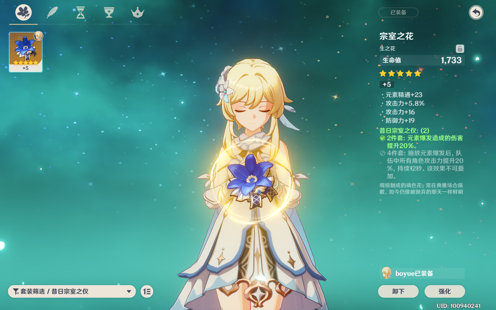 圣遗物:宗室4件套,推荐攻击沙,岩伤杯,双暴头;副属性优先级推荐双暴>攻击>充能。