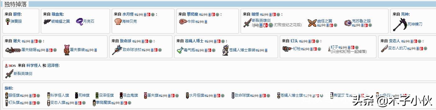 二、掉落物奖励 有死神镰刀、断裂英雄剑(用于制作泰拉之刃)等 其中,断裂英雄剑25%的概率掉落自蛾怪。