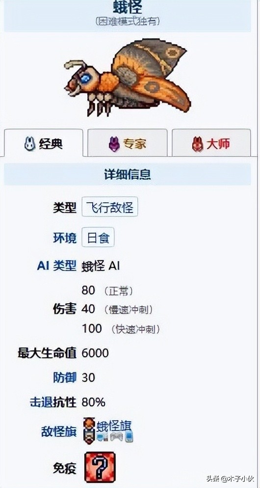 泰拉瑞亚日食蛾怪出现条件:蛾怪是一种强烈的飞敌怪,在日食事件中产生,可以通过物体的块状结构。玩家击败所有机械 boss之后才能生成。