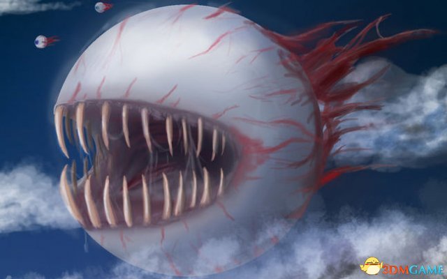 克苏鲁之眼看起来就像一只巨大的恶魔之眼。像大部分其他Boss一样,它可以穿墙。