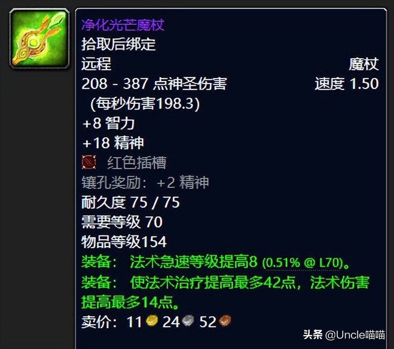 对于牧师玩家来说已然笑嘻嘻,毕业魔杖我来了,不错,此款小怪魔杖的话不仅高属性加持而且还带插槽可谓NICE,8点的急速虽然不高但是也很享用,42点的法术治疗提高无论如何都是美滋滋了。神牧必入好吧。