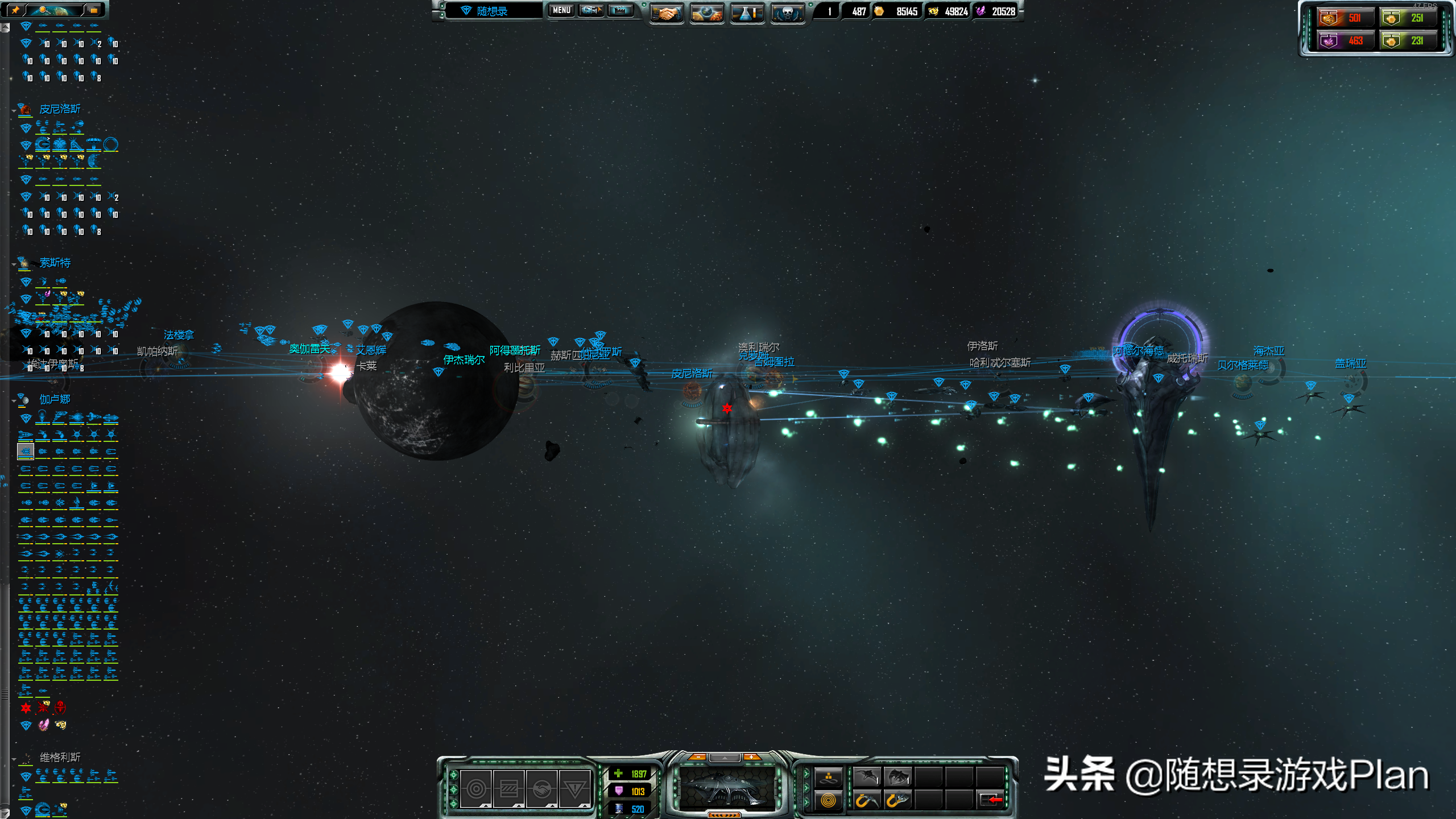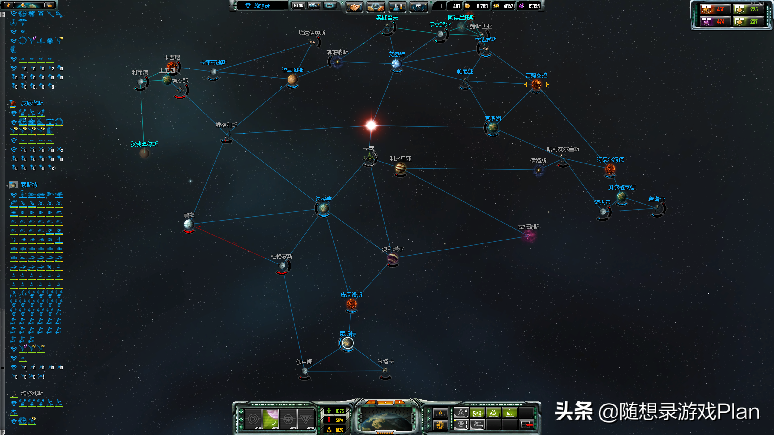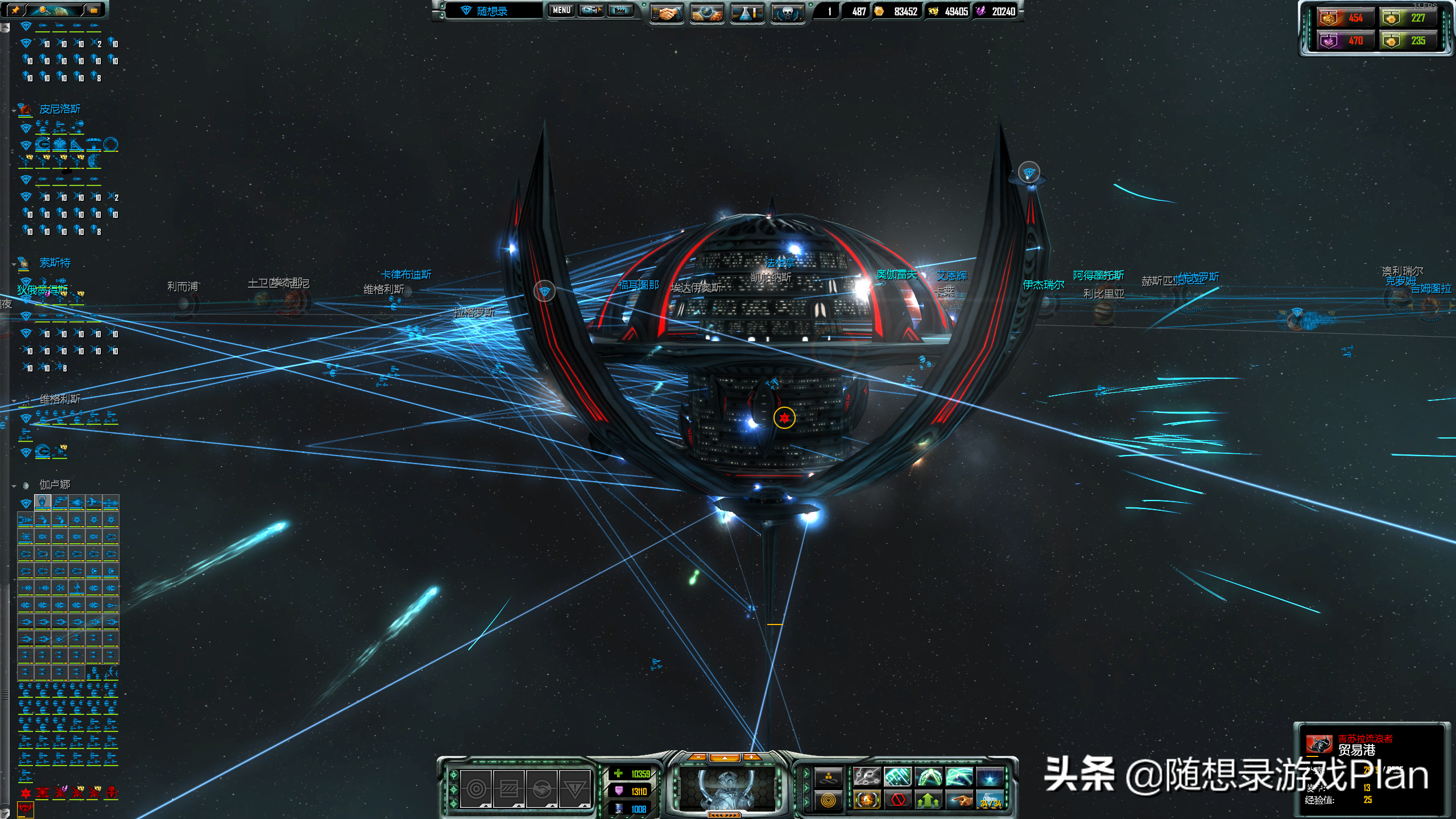 开采很好理解,行星的周围会有一些资源星,建立矿场收集稀有资源。稀有资源都是建造建筑、制造战舰以及研究科技的必备物品。