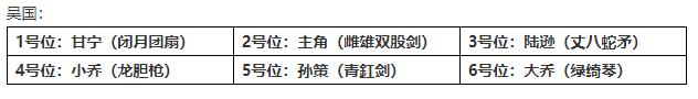 吴国一号甘宁前排眩晕加全体命中首当其冲,配合团扇打出沉默和中毒,主角的剑客时装或者夜叉时装打出眩晕或者十字型伤害且减怒,陆逊全员灼烧配合丈八打出多段伤害,增加自身命中,小乔后排爆发减怒打出龙胆额外伤害,孙策的破阵效果,若不被控制或者减怒,可连续两回合触发青釭剑,选择最优。大乔增加回复和免伤,配合绿绮琴再次提高奶量与双抗,完成续航。