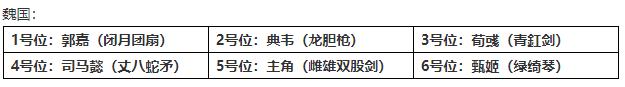 郭嘉一号位打出敌方全体降低伤害并配合团扇打出中毒与沉默,典韦单列爆发,手握龙胆增加暴击,荀彧作为魏国输出,手持青釭剑打出百分比生命伤害,配合流血,伤害拔群,司马懿提高命中打出控场,甄姬与主角不做解释。