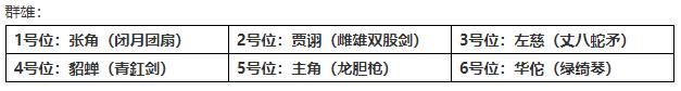 张角控场优先级最高,打出减怒,配合团扇打出沉默,贾诩喷毒,追加扇子带来的毒伤,左慈后排变身,放置于三号位,配合丈八,有效控制,貂蝉配合青釭剑生命百分比伤害打出更高的爆发,主角与华佗不做解释。