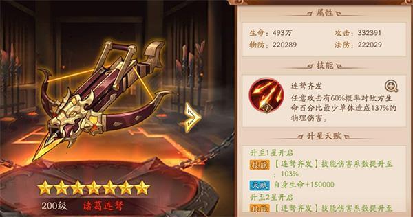 浅解:连弩plus了解一下,帮助此刻平民玩家输出武将打出爆发的神兵基石。增加2回合暴击率,对于马超这种具有回怒,有持续伤害的武将,更是福音。对于貂蝉对这种对于生命低的武将有额外伤害的机制,龙胆枪有奇效。龙胆枪,此刻是平民玩家必备的金神兵,请及时合成升星!