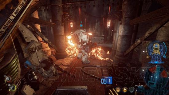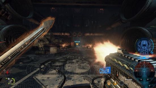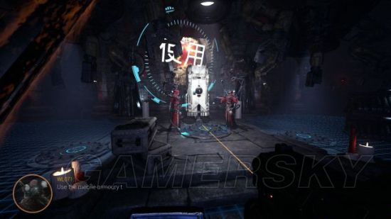 step2.来到废物处理室,打开门后马上将门关闭,以触发里面的机关炮,那么就可以隔着门骇入机关炮并且利用它射杀里头的敌人。