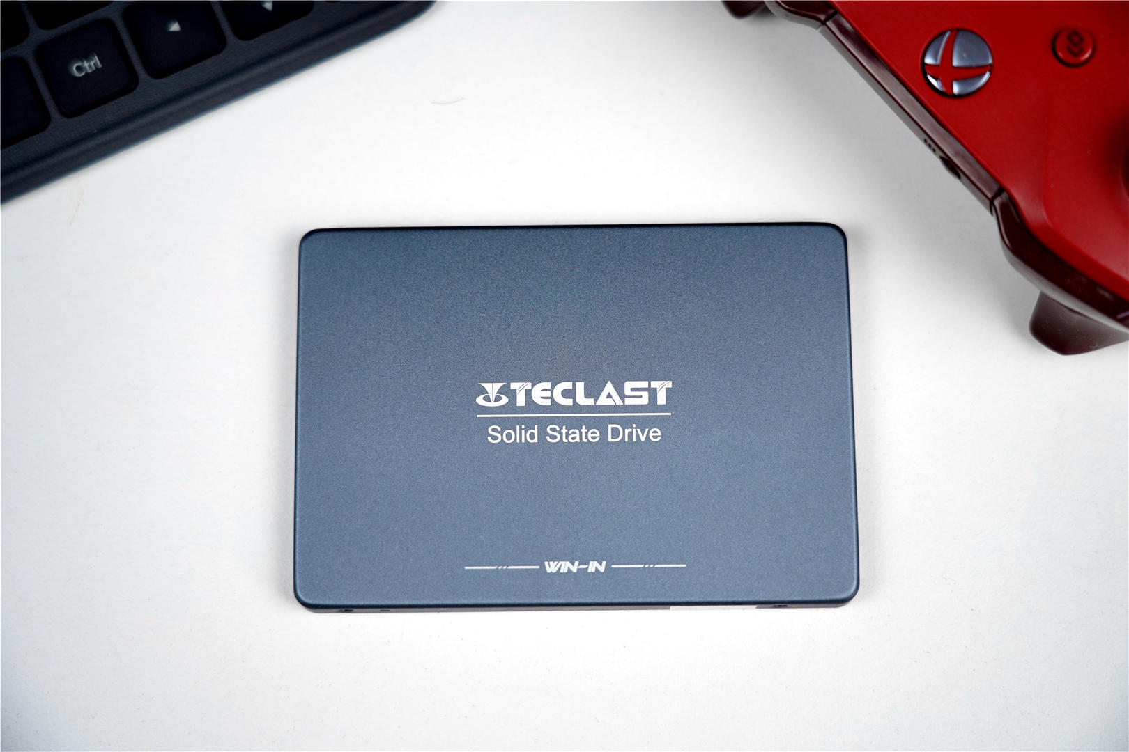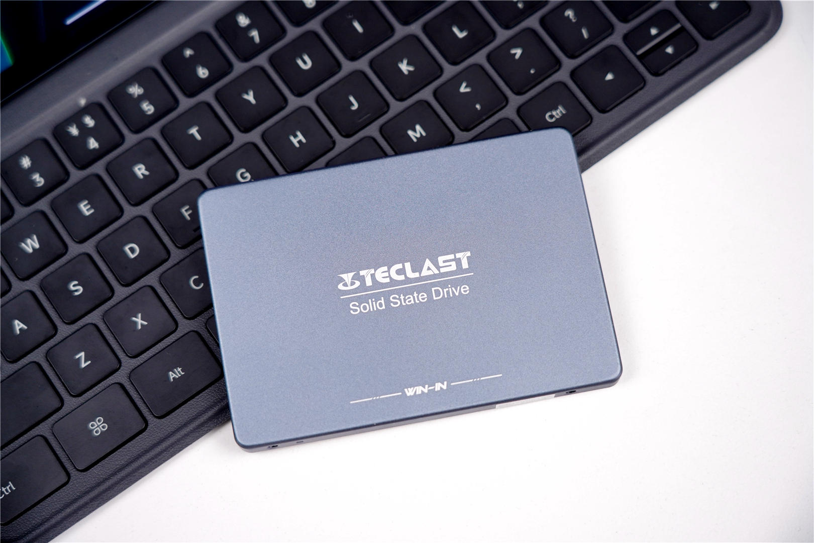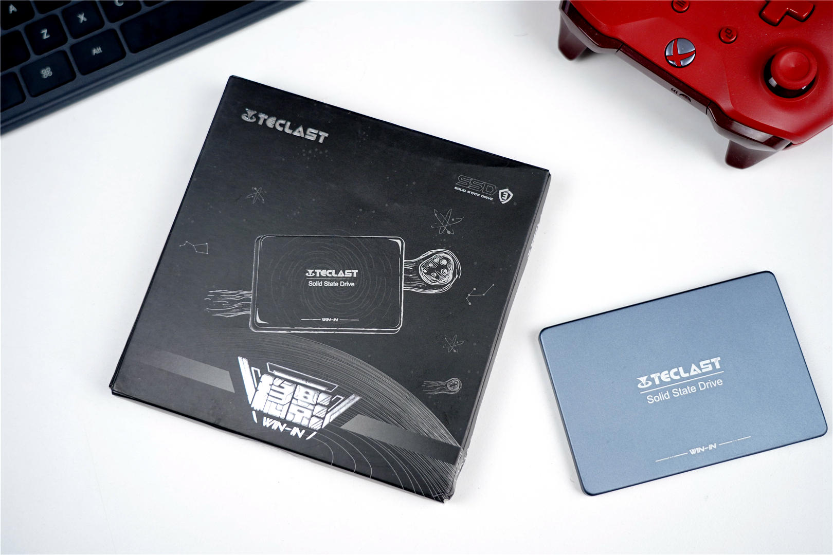 台电(TECLAST)稳影固态硬盘的包装很简单,全黑色配色看上去非常的沉稳。正面左上角是TECLAST的logo,中间是这款固态硬盘的全景图。底部有“Win- In”以及中文名称--稳影。