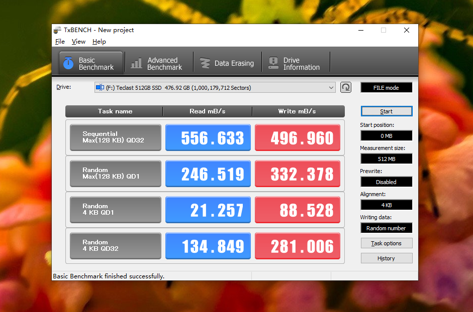 TXBENCH,在2048KB的顺序测试中,硬盘持续读取速度为556MB/s,持续写入速度为496MB/s,结果比官方还要高出一截,看来是官方保守了。