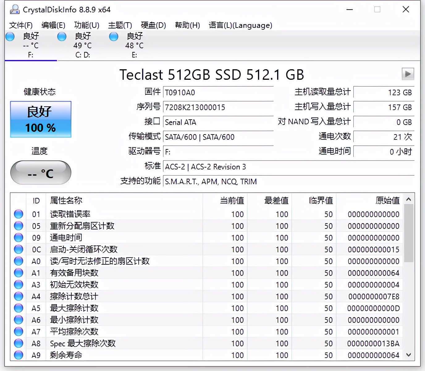 台电(TECLAST)稳影固态硬盘固件T0910A0,采用SATA 600传输模式。