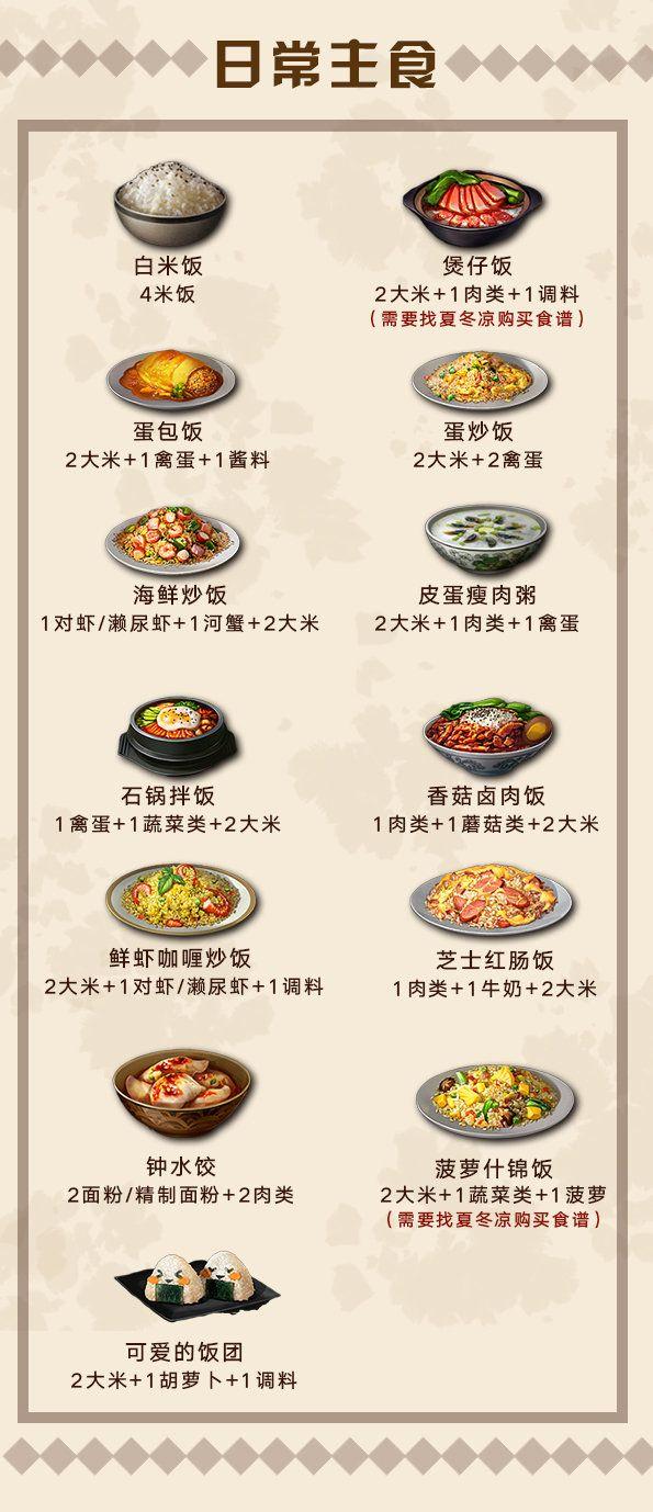 米饭1、白米饭:大米2、蛋包饭:2大米+1禽蛋+1酱料3、蛋炒饭:禽蛋+大米4、煲仔饭:1肉+2大米+1调料5、芝士红肠饭:肉+牛奶+大米6、石锅拌饭:蔬菜+禽蛋+大米7、香菇卤肉饭:肉+蘑菇+大米8、椰子炖饭:椰子+大米9、南瓜手抓饭:2大米+2南瓜10、海鲜炒饭:河蟹+对虾+大米11、菠萝什锦饭:1蔬菜+2大米+1菠萝12、鲜虾咖哩炒饭:对虾+大米+调料