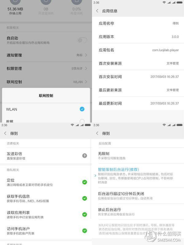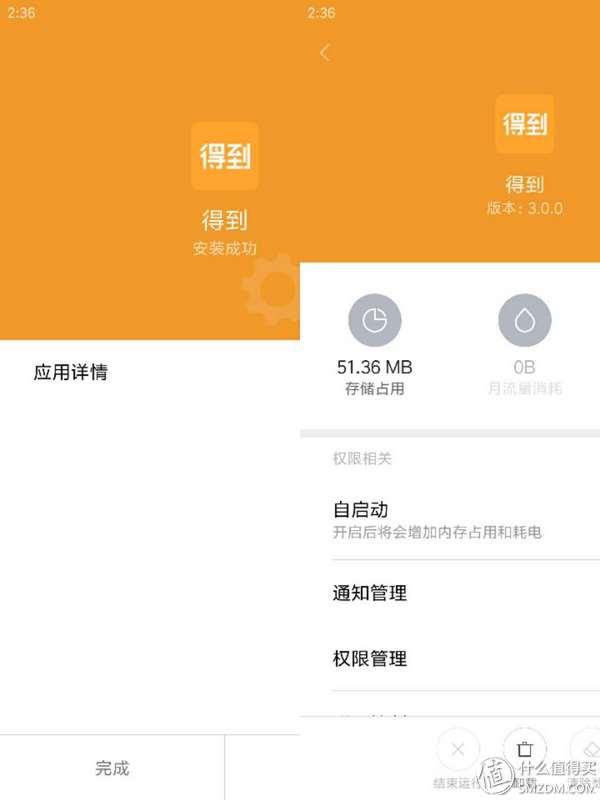 在安装完成时,可以直接通过应用详情,对应用的权限等进行配置,包括是否自启动、权限管理、联网控制、通知管理、后台运行选项等选项。