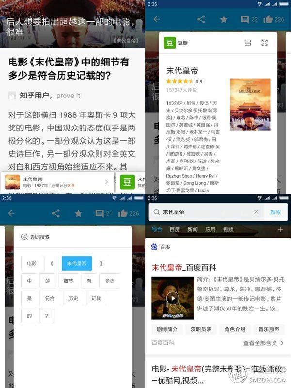在实际使用过程中,碰到想搜索的东西,是比原来方便许多。参照下图,长按时,传送门弹出,如果是上面支持的几种数据,则首先会出现词条,方便直接点击查阅。左滑列表到最后是选词搜索,可以选择我们实际需要的词语进行百度搜索。