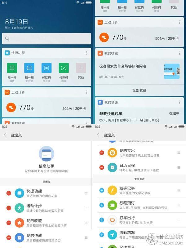 相比MIUI 8,MIUI 9优化了负一屏的信息助手,卡片显示更美观,聚合信息更有效,提供了包括快捷功能、记步、日程、快递等信息。