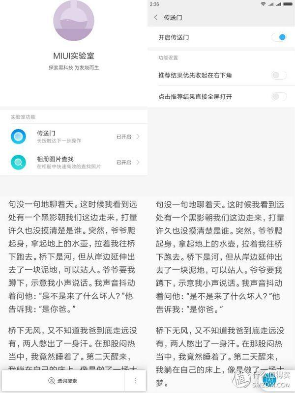 宣传中传送门是一步直达目标内容,通过长按信息内容,即可得到如影评、百科、地图、分词搜索等信息。目前支持八种数据类型。在开发版中,该功能是默认关闭的,需要在设置->MIUI实验室->传送门中打开,还可以进行一些设置如下。