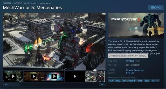 《机甲战士5:雇佣兵》Steam商城售价为90元,目前评价为“多半好评”,大多玩家给出差评的原因是因为游戏没有中文。