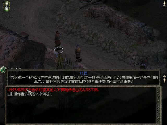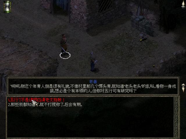 在猎户家右边的民居旁对话老者选“请老丈指教”学习五行知识(智力+1):金克木、木克土、土克水、水克火、火克金、木生火,火生土、土生金、金生水、水生木。金攻眩晕、木攻中毒、水攻冰冻、火攻溃散、土攻石化。如有火属性武器含暗属性,可带木属性戒指在持该武器的手上,因为木能生火可激活该武器暗属性。