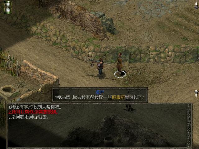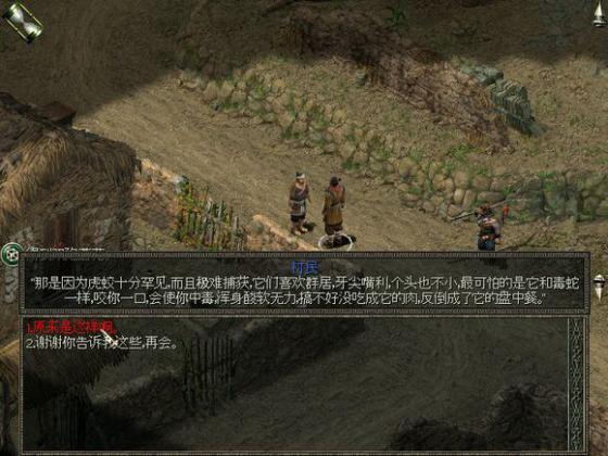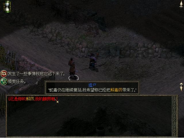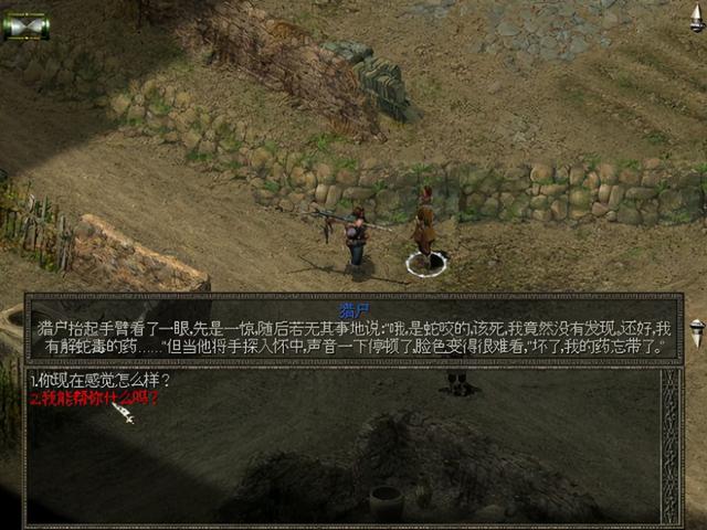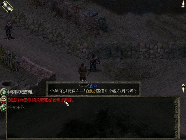 做猎户任务:在中间路口遇到猎户,对话猎户选打量对方,发现猎户右臂上有一个很小的伤口,似乎是被毒虫咬伤的。猎户发现自己没有带解毒药,而毒性的迅速发作使他无法移动,于是他请求你帮他回家拿解药选“需要报酬”。猎户家在村子左下角院中有一棵大树,在猎户家中的武器架上找到解毒药,将解毒药交给他获得虎皮(普防越高越好,用来打造高普防护具)。