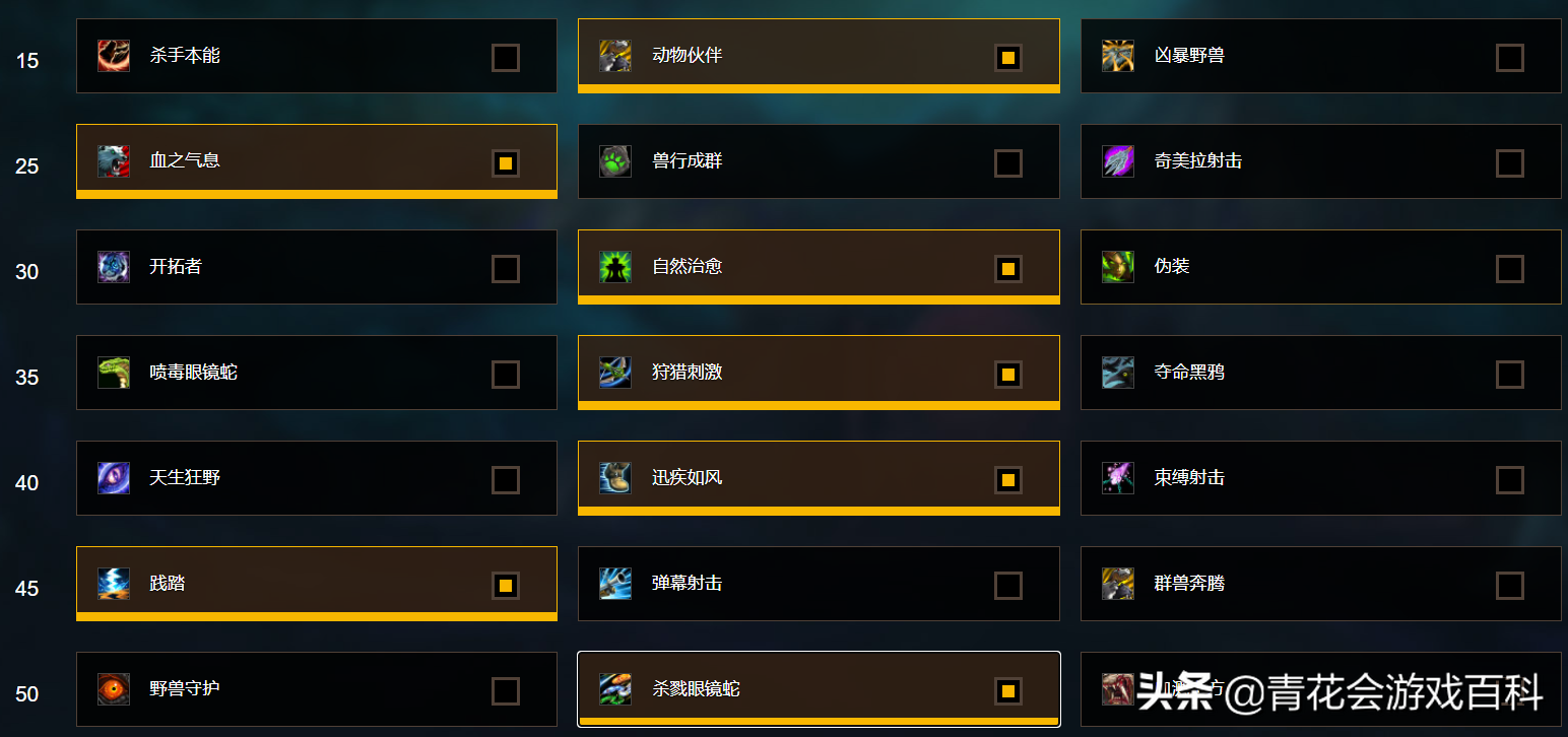 各位可以看到两种天赋的差异其实不大,大秘境功能层选择“伪装”和“束缚射击”方便跳怪和控怪;团本选择“自然治愈”和“迅疾如风”增加生存能力和机动性。