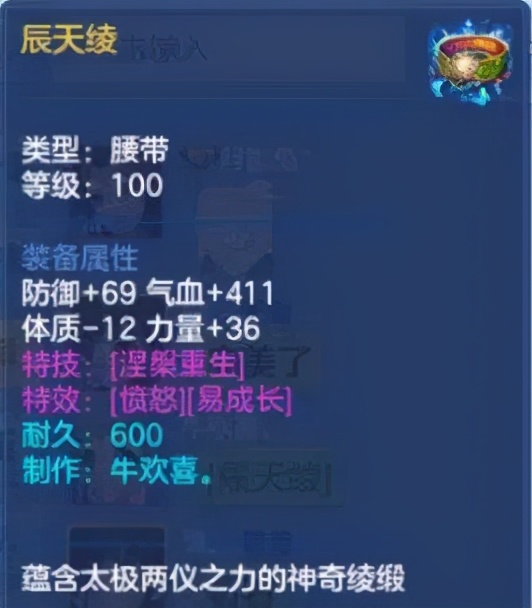 首先我们来看一看这件100级的三红腰带辰天绫。基础属性方面,防御+69略有些低了,气血+411也说不上是很高的数值,单加力量36还是可以的。不过这毕竟是一件三红装备,基础属性不够高没关系,只要出的是好红字就是好装备。那么我们看一下这个特技,“涅槃重生”,可以复活己方所有死亡的队友,并恢复满气血及气血上限,这个特技还是挺bug的,辅助类带上它肯定能在PVP中让对面怀疑人生。再看特效,“愤怒”和“易成长”,可以说是优秀腰带的标配特效了。综合看来,对于打辅助的小伙伴来说,这是一件一份不错的三红装备了。嗨呀,人家都是三红了,还要啥自行车啊!