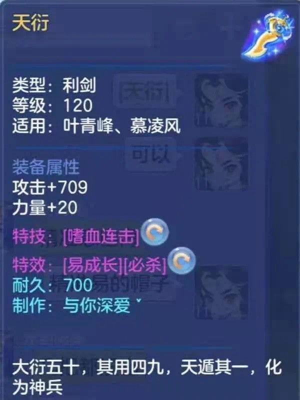 接下来我们来看一看这把120级的三红武器天衍。首先基础攻击+709这一数值大概已经是接近120级武器属性天花板的水准了,单加20的力量稍微有点低,总体来说基础属性还是很不错的。并且这是一件三红装备,特技“嗜血连击”可以连续攻击敌方单个目标2次,可以说是物理输出们最喜欢的一个特技了。再看特效,一个“易成长”是好装备几乎必备的特效,能让宝石镶嵌的效果进一步提升;另一个“必杀”,提高物理攻击出现必杀的几率。这连击和必杀都有了,攻击还加这么高,一次攻击下去对面有几个人扛得住?这件天衍可谓是物理输出的梦想装备。