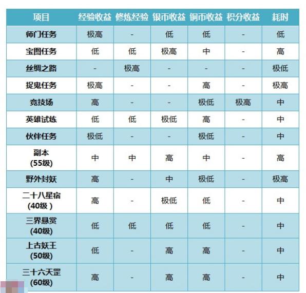 在常规中任务、副本、每日挑战中都可以获取大量的经验,不过其中也是有着经验、修炼经验、铜币、银币、竞技场积分之分,而下列的表格就是很详细的记述了",每日必做"的收益情况,玩家可以按照自己需求进行自行挑选。