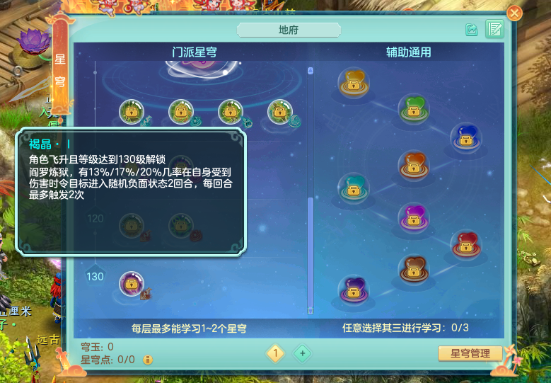 再来是星穹选择方面,胖熊推荐大家使用青冥1、蓝玉2、橙光2补橙光1、碧幽3补碧幽4、紫电2、赤霄2以及褐晶1。首先拉环作为地府核心中的核心,但凡能提升一定不要放过,因此紫电2与青冥1必须点满。而褐晶1则可以让我们在领域中被攻击时有几率给目标施加随机减益状态,无论是在日常还是PK中都相当实用。