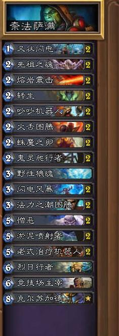 简单介绍一下打法,起手最好有克总,前期就是各种嘲讽加清场,全力苟住,小蜘蛛各种图腾加火舌的解场效果不错,关键时刻还有叉闪和风暴,转生可以给中期的嘲讽生物用,用来保证存活。苟到8费上克总的时候场上只要有一个嘲讽生物就赢了。