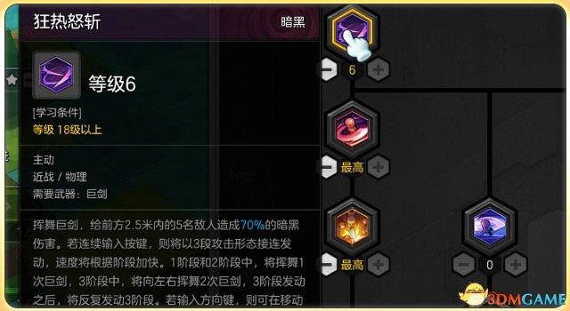 狂热怒斩的攻击便捷性远不如横扫千军,不过唯一的好处就是不需要耗费能量即可使用,所以在贫能情况下可以用它攻击,至于点6点只是为了满足黑暗支配者的开启条件罢了。