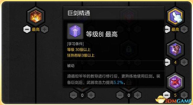即使是满点的巨剑精通也不能带来可观的伤害加成,但需要注意的是本着无脑输出,能少按键就少按键的原则这个技能还是需要点满的,毕竟通过该技能的加成横扫千军的伤害还能够提升一些。