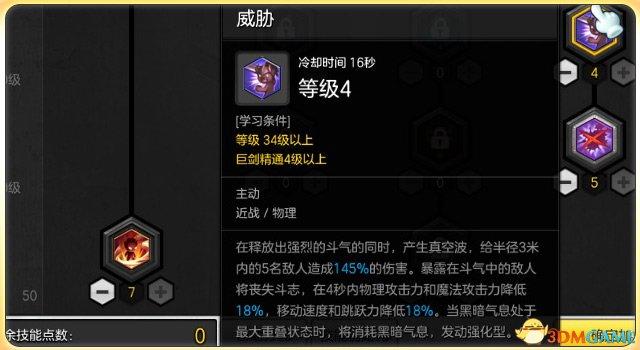 威胁虽然能够对半径3米内的敌人造成伤害,但这里点出4点的原因主要还是为了触发出血技能,而在个人眼中威胁的作用还是来自于它的减益效果:降低目标18%的攻击力和18%的移动跳跃力,所以该技能可以帮助狂战士更好的粘人攻击以及降低自身受到的伤害。