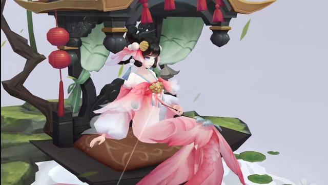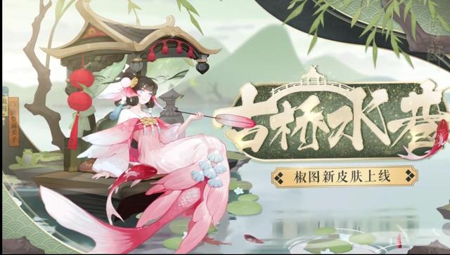 直接来看看这款国风皮肤吧。这款皮肤不愧是典藏皮肤,与其他的椒图皮肤都是不一样的。这款皮肤中,椒图没有坐在蚌壳中,而是坐在一个小亭(或者说是小桥)上的,管他是桥还是亭,反正好看就行了。椒图本是人身鱼尾的美人鱼妖怪(主要是美,是不是蚌壳精不要过于纠结),但是在其他皮肤中,感觉椒图就像是一个蚌壳精一样,个人感觉挺奇怪的。