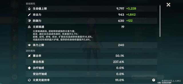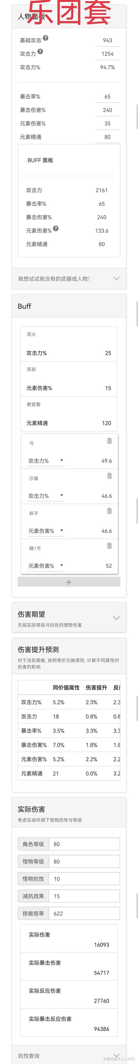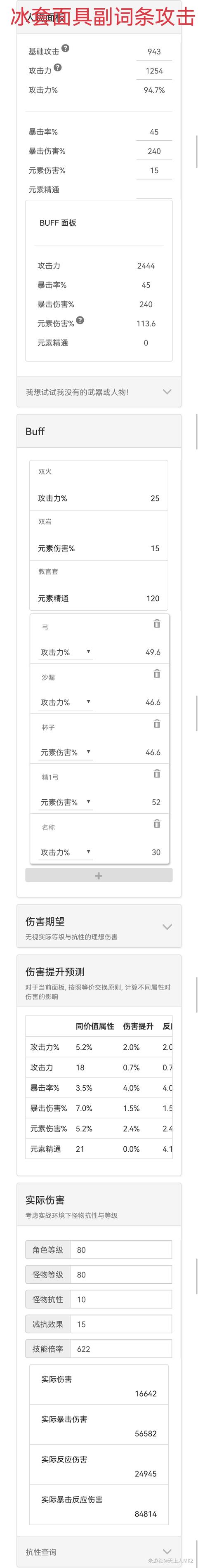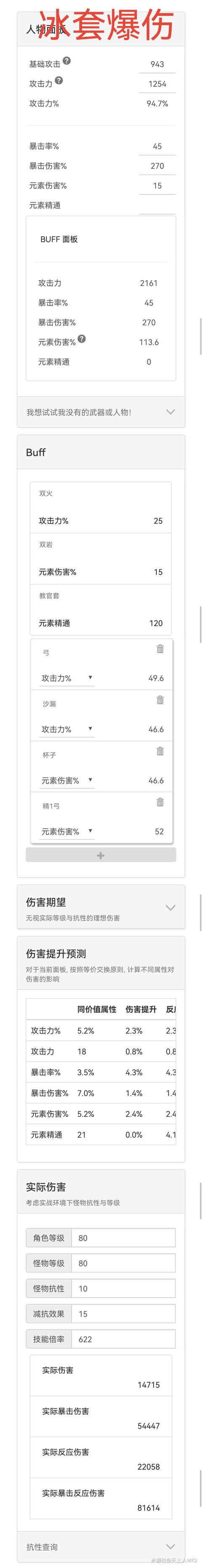 攻击力:基础攻击943+羽毛311= 1254元素伤害冰套:精1阿莫斯52+冰套15=67元素伤害乐团:精1阿莫斯52+乐团35= 87