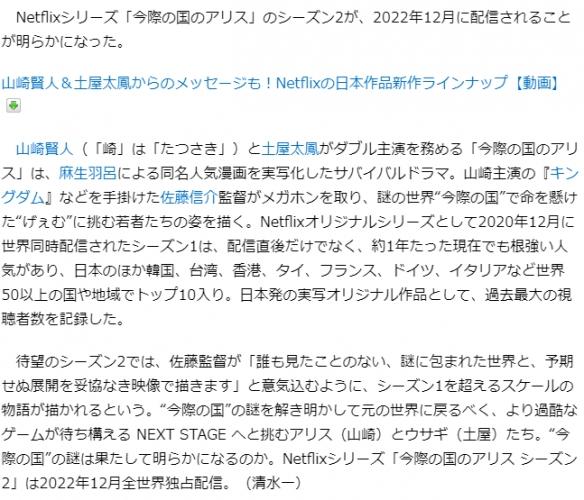 Netflix系列《弥留之国的爱丽丝》的第二季将于2022年12月发布。山崎贤人与土屋太凤共同主演的《弥留之国的爱丽丝》,是将麻生羽吕人气漫画拍摄成真人版的生存电视剧。由编剧佐藤信介掌镜。作为Netflix原创系列,第一季在2020年12月全世界同步上线。不仅在发布后不久,即使在约1年后的现在也有着根深蒂固的人气。除日本之外,在韩国、中国台湾、中国香港、泰国、法国、德国、意大利等50多个国家和地区也进入了前10名。作为日本原创的真人版作品,它创下了史上最多观众数的记录。