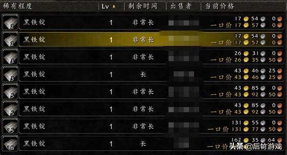 来看拍卖行价格,黑铁矿石平均1个在50银左右,黑铁锭一个7金左右(价格看需求),所以1组黑铁矿石(10个)的熔炼我们能赚5金左右。当然,我们赚的,除了熔炼黑铁的技能(不是人人都会),主要是跑路的辛苦费。
