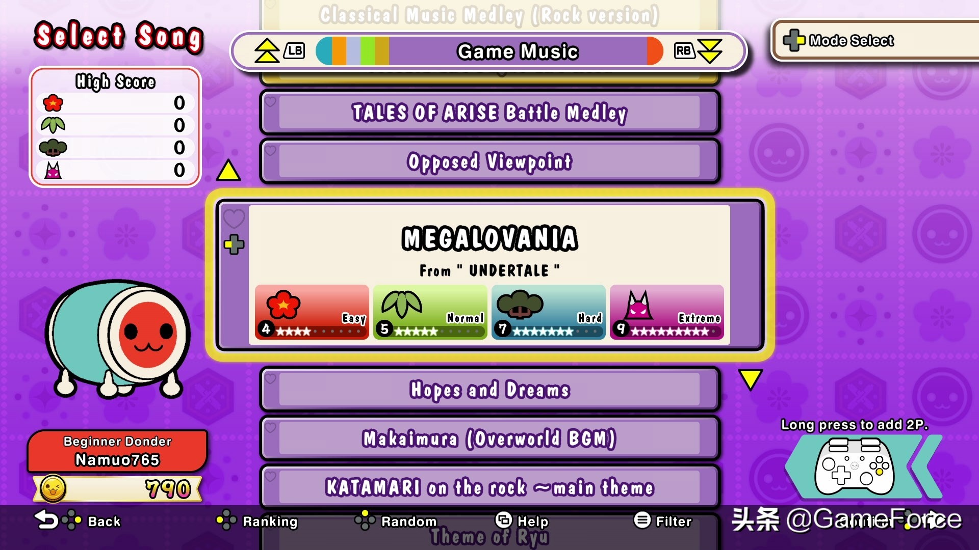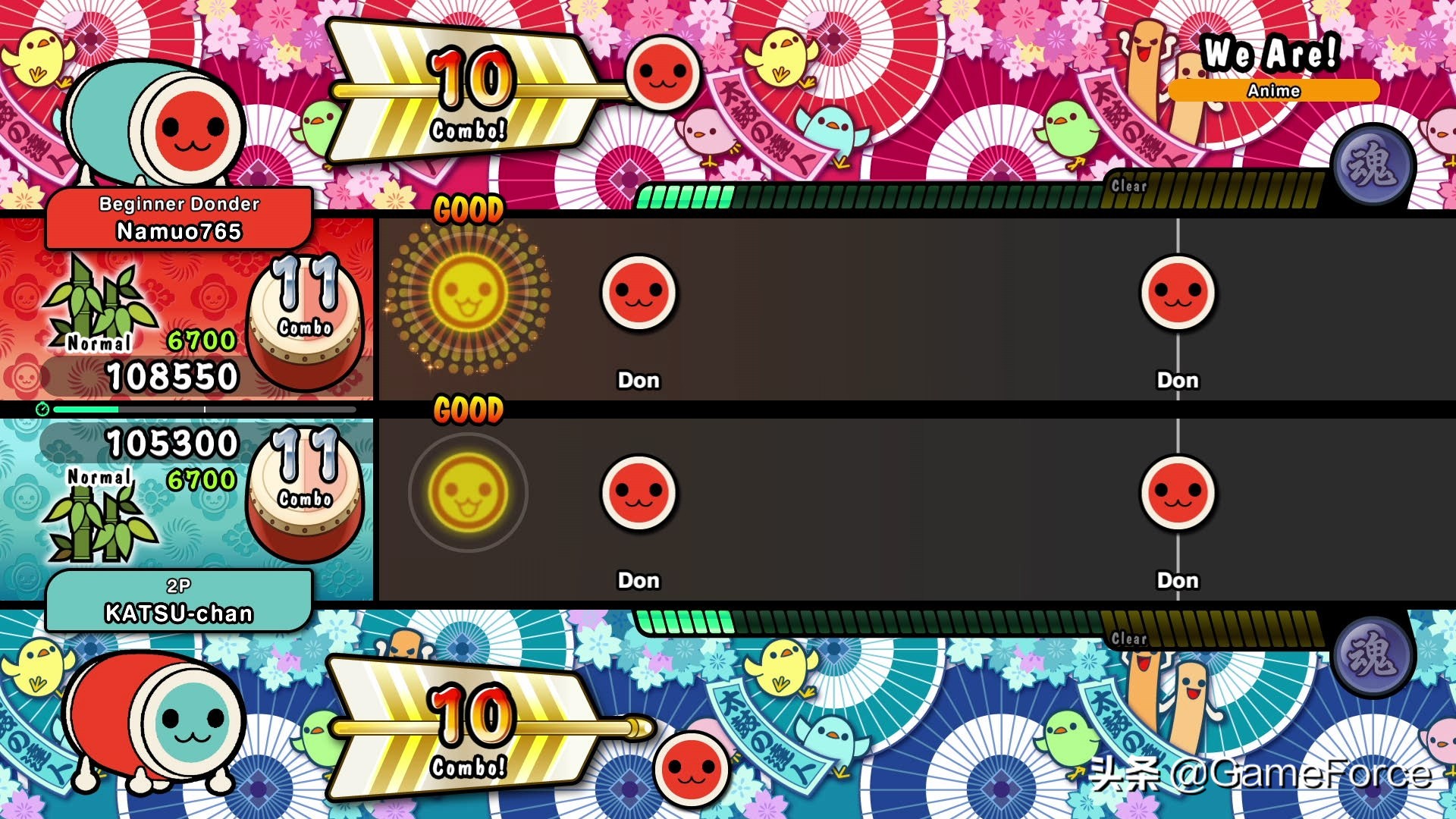 官方专用的太鼓控制器目前尚未推出,只能用手柄操作,太鼓系列长期以来基本操作只有击鼓和敲边,组合操作也不过是双击、双敲、连击,所以使用手柄游戏也没有难度很容易上手。设置选项里有三种类型可选,笔者习惯是把手柄面部十字键和ABXY按键设为击鼓,肩部四个按键设为敲边,区分出两种不同的手感体验,连击时可以使用搓十字键加按键形式
