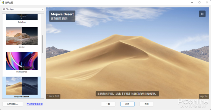 接着就来到WinDynamicDesktop设置壁纸的主界面,界面简单,左侧为主题壁纸选择区域,右侧为预览区域,选中一个下载好的主题壁纸,就可以在右侧预览该主题壁纸在各个时间段的不同的展现。