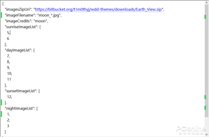 "imageFilename": "earth_view_*.jpeg", 这一行代表的是这组壁纸主题里的图片文件命名方式,*号表示数字。