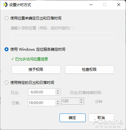 然后我们就要设置“计时方式”,也就是说WinDynamicDesktop是通过时间来确定动态壁纸的变化的,这里可以设置为手动定位、自动定位以及特定的时间,手动及自动定位后WinDynamicDesktop就可以根据当地的日出日落时间来动态调整。