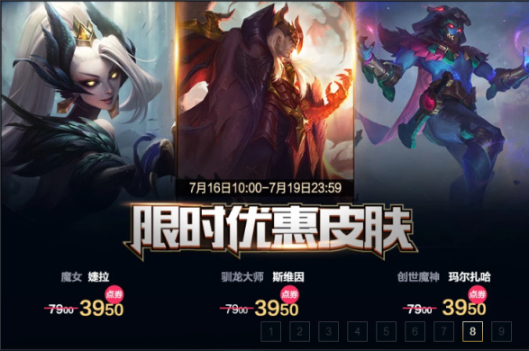 这次的半价皮肤分别为:驯龙大师斯维因、魔女婕拉、创世魔神玛尔扎哈