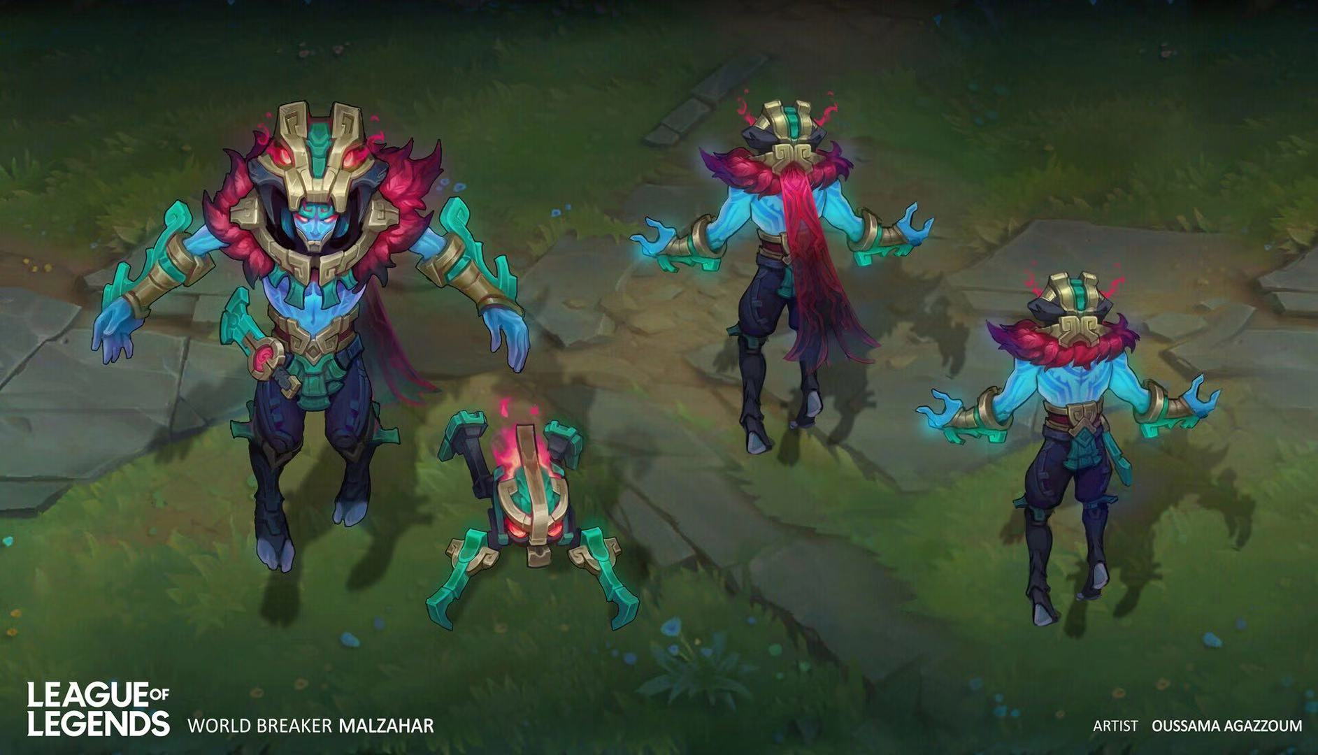 在游戏内,玛尔扎哈整体造型采用了比较多的类似玛雅的装饰,红蓝配色也比较有神秘感,被动的护盾也是红蓝相间的神秘符文,还是挺有质感的。q技能两端会有守护神的头像,w技能的小虫子也是好像青铜器成精,释放大招时敌方下面会有巨大的神秘图腾。