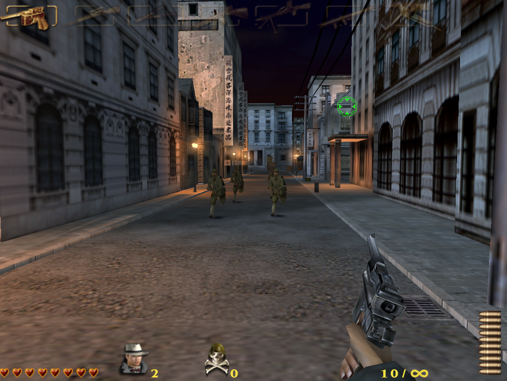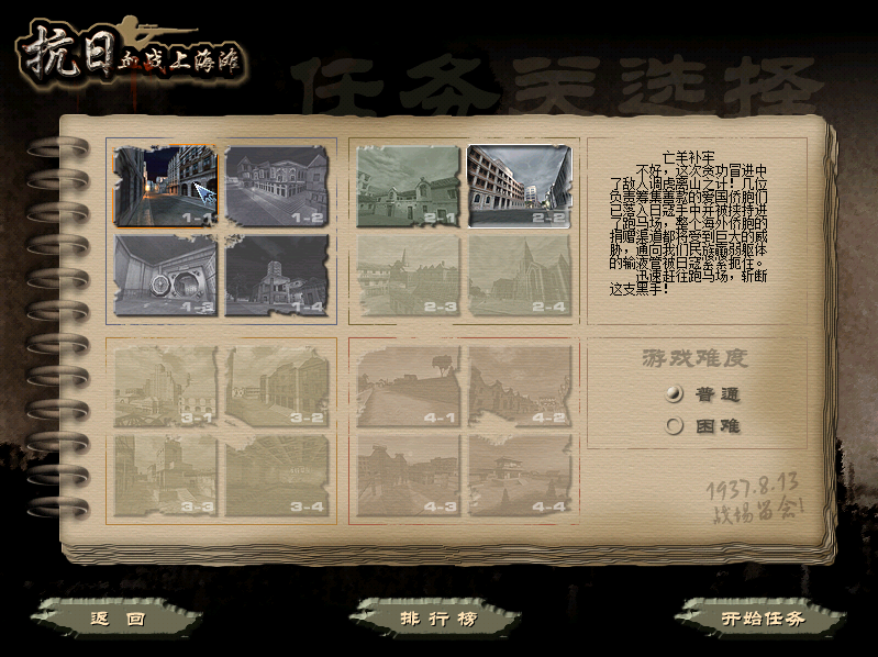 第一个游戏场景是在上海最繁华的外滩点燃,然后汇丰银行、码头、跑马场、怡和洋行、联合教堂 苏州河/白渡桥、百老汇、日军租界使馆、虹口大剧院,一直打到日军海军陆战队司令的住宅,最后杀了日军司令-长谷川清。
