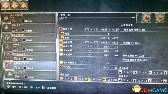 关于千影这把武器需要注意的是:强化满之后血质补正是S,不过血质的S补正只有在L1开启自残模式下才有效。还有就是在千影的普通模式下按L1把刀插入刀鞘的时候马上R1轻攻击,这一下拔刀斩是享受所有补正效果的伤害非常爆炸。