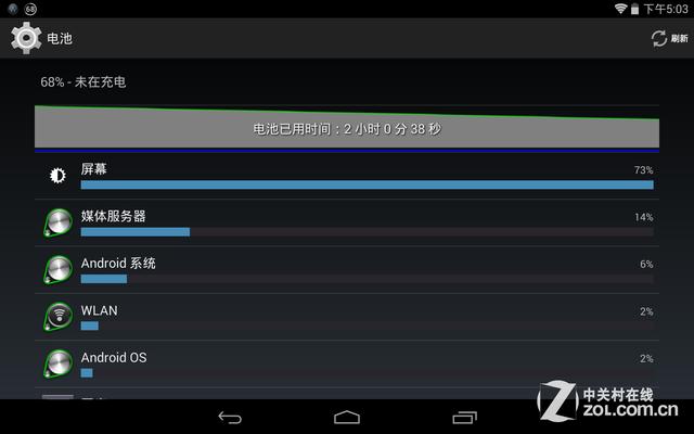 在播放了两个小时后电量剩余68%,消耗了32%的电量。根据提示,尚可以使用4小时5分,约可以使用6小时。这个续航时间,在安卓平板中,只能算是中等。