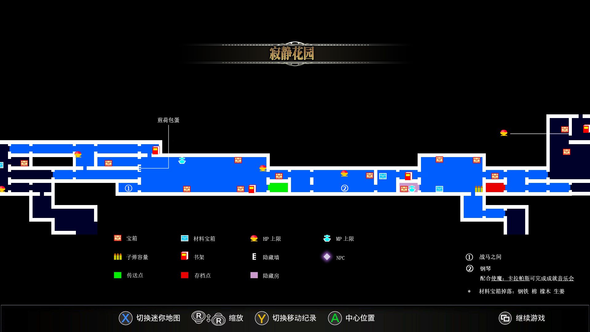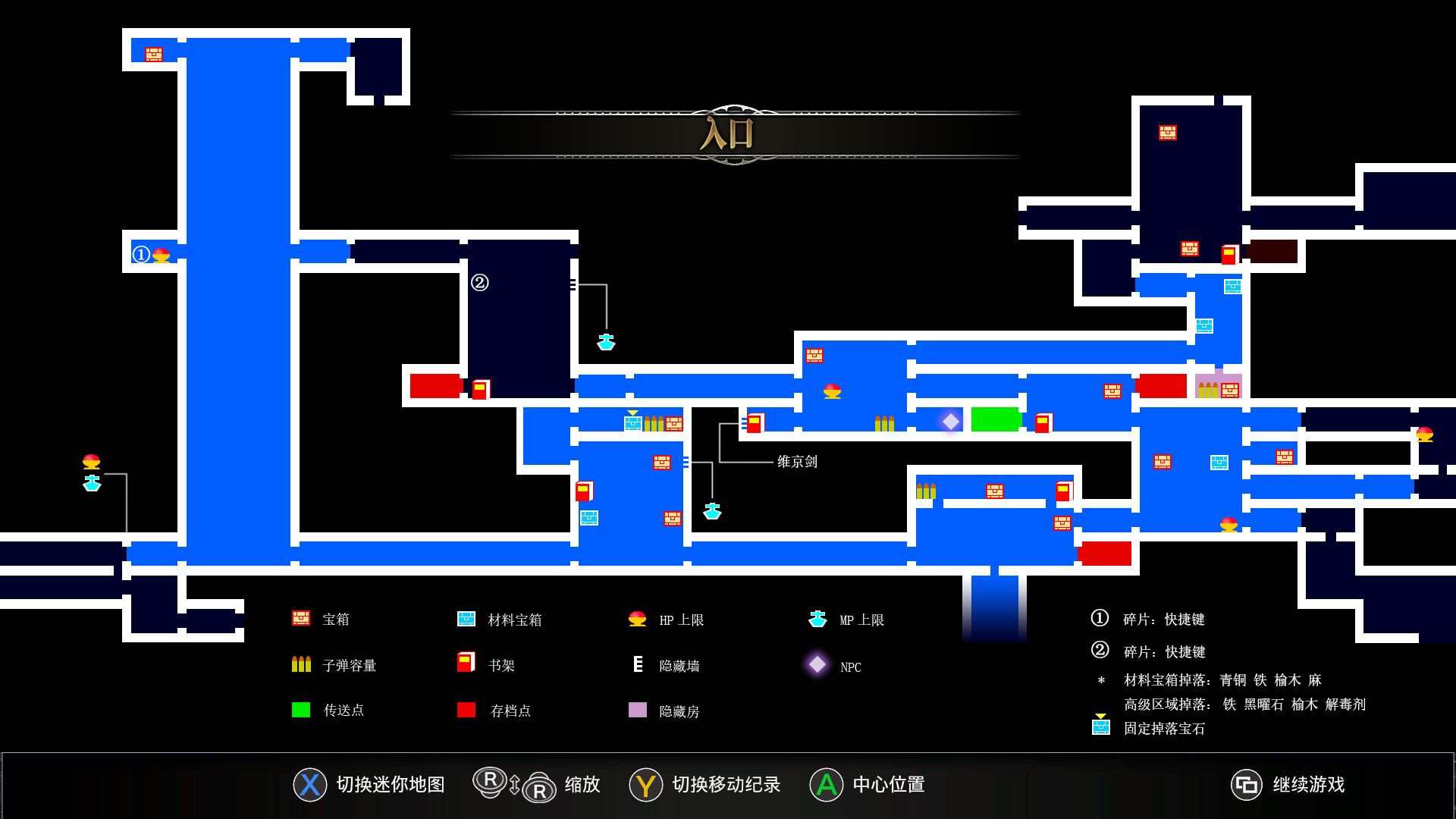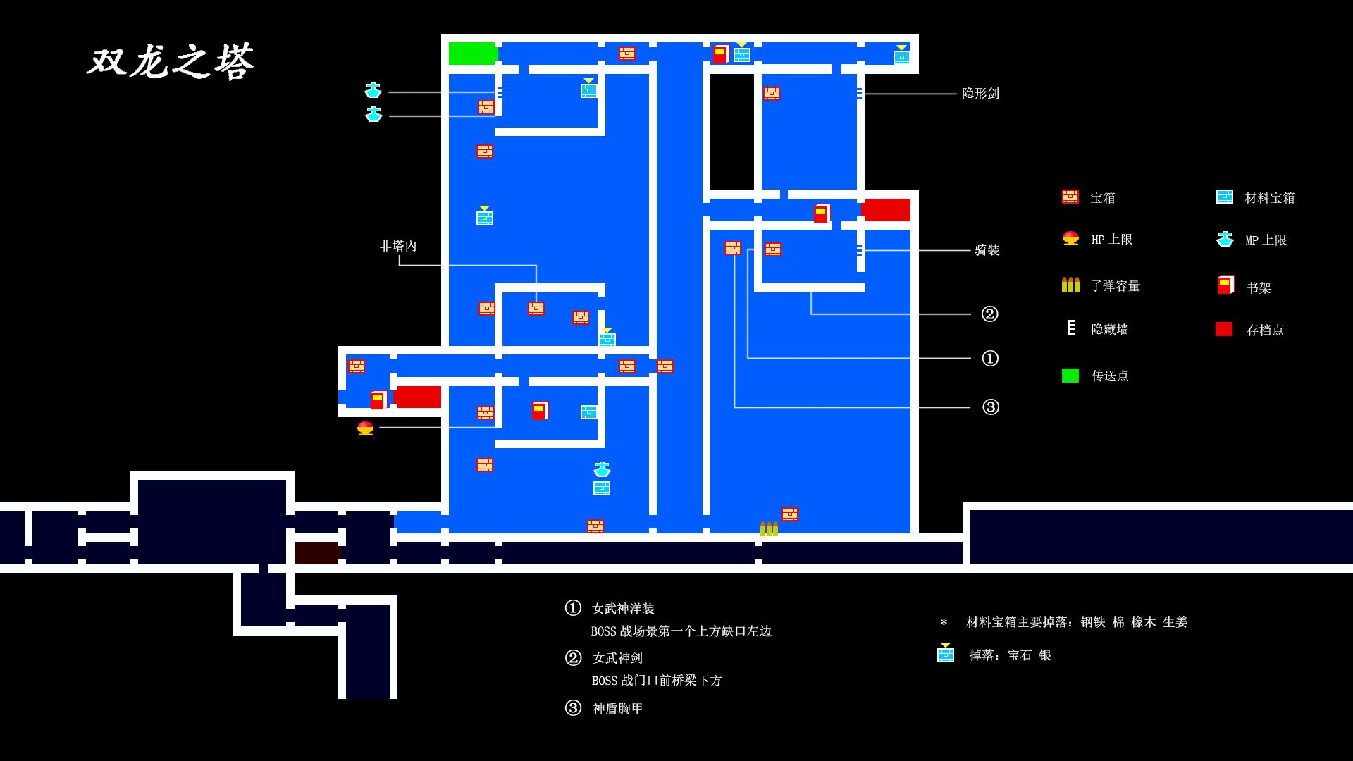 本场景因为是本作少有的立体场景,因此道具的分布在平面的地图上表现有点奇怪。但是除了神盾胸甲难找,没有其他任何难找的关键任务道具。完全可以后期学了大跳之后再来收刮✦大跳即碎片:跳高,二段跳+魔牛的羽毛合成,魔牛的羽毛在东方实验室击杀牛怪掉落。早合早享受,属于必合碎。