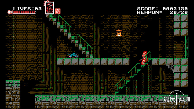 然而这种高难度的平台跳跃,正是初代恶魔城吸引玩家一遍又一遍挑战的动力。《月之诅咒》全盘继承了这种虐人的关卡设计,就好比移动的平台让你难以下脚,脚边的悬崖给人无形的压力,从各个方向向你发动自杀式袭击的怪物,以及悬挂于空中的灯(打破就有奖励),诱惑着每一个,特别是残血的玩家起身跳跃。
