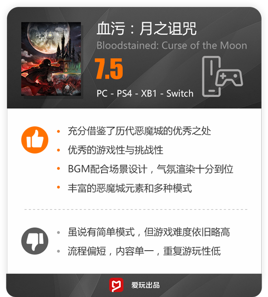 在恶魔城系列粉丝的眼光来看,它是2D动作类恶魔城的上乘之作,无论是它经典的恶魔城元素,还是把我们带回FC时代的像素画风和操作手感,以及山根美智留创作的恶魔城音乐,都深深拨动着老玩家的心弦,告诉我们“恶魔城犹在”。同时《血污:月之诅咒》又推出了简单模式来吸引新玩家,让新老玩家、高玩与手残党都能其乐融融,但是本作仍有两个遗憾。